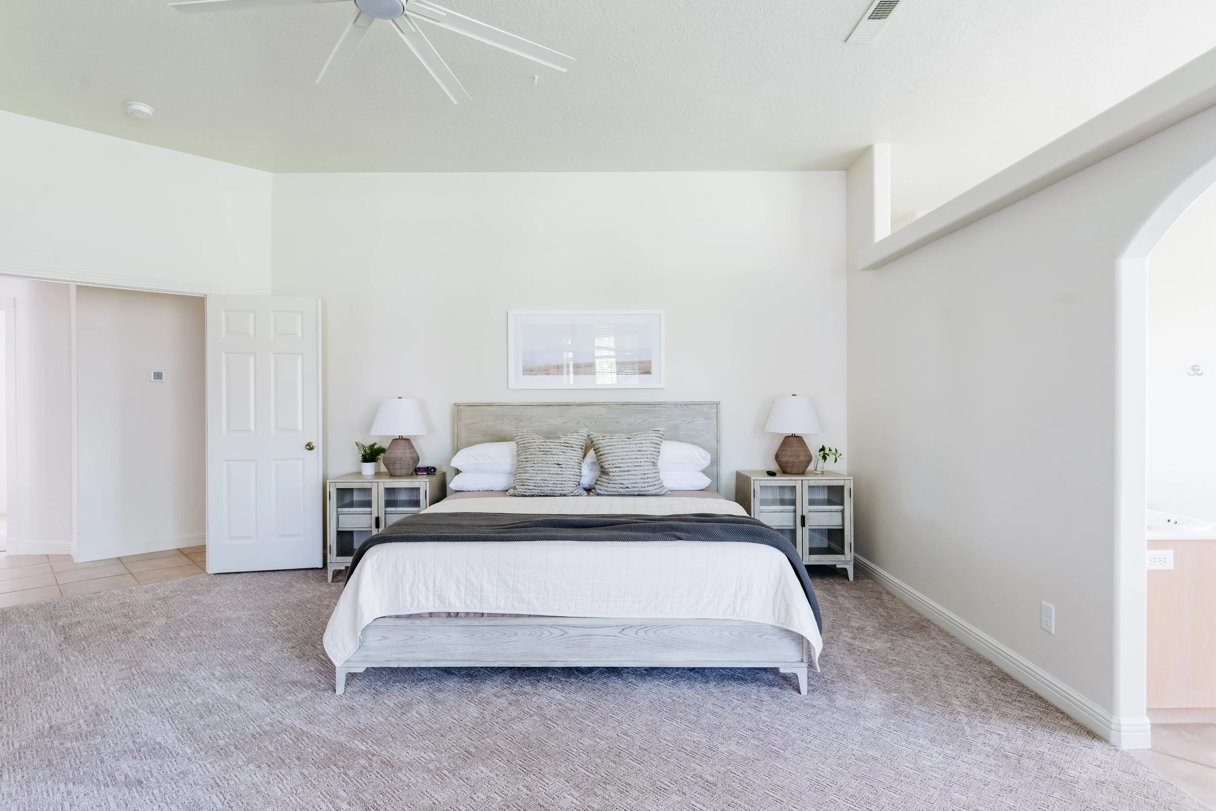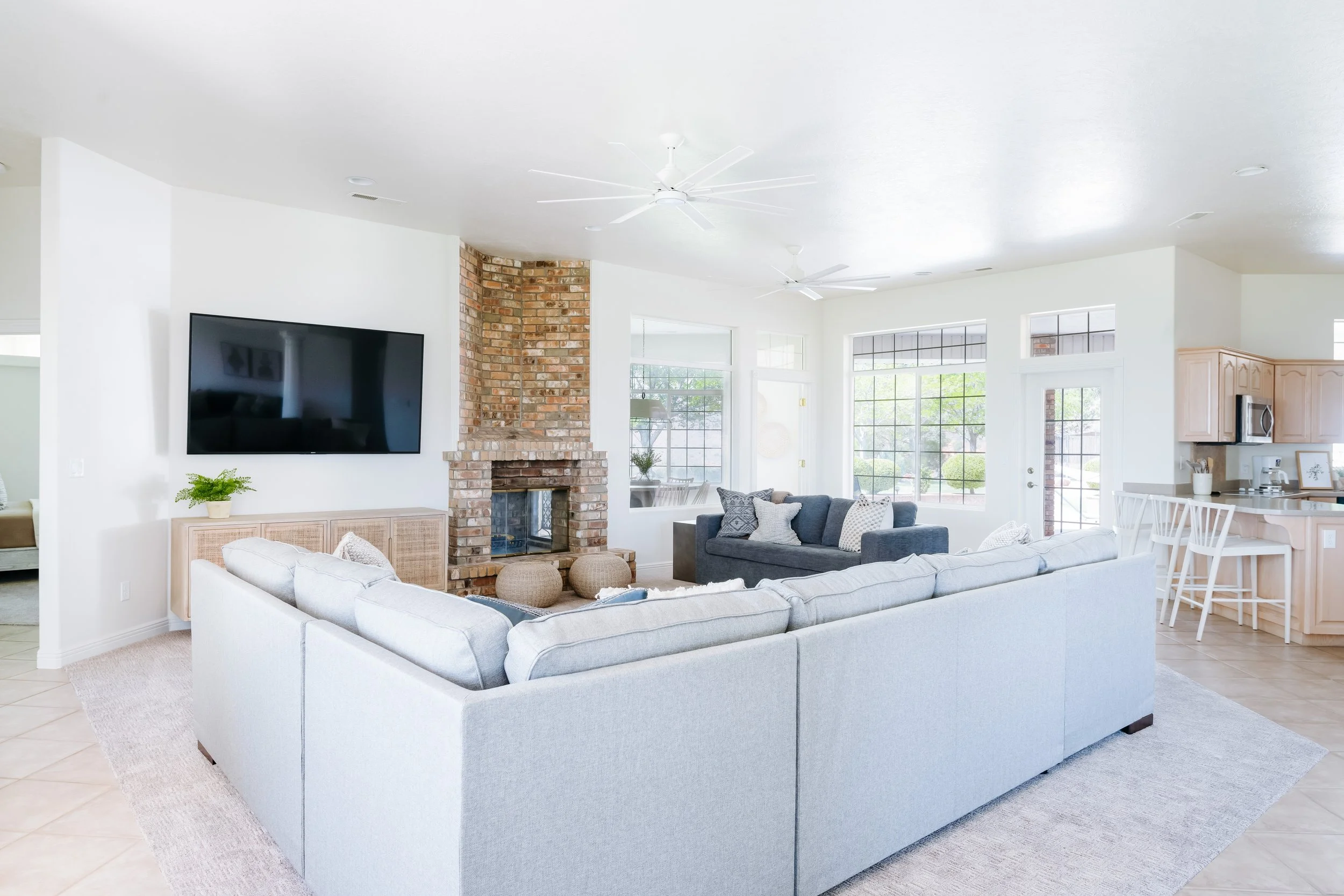 Warm and inviting, this home has 4 bedrooms and four full bathrooms and comes with an entertainment room upstairs. The primary bedroom as stellar view of Zion National Park and the sunrise. This home sleeps 14.